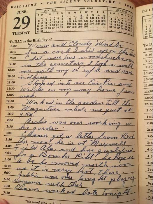 Eleanor got a letter from Bob this noon, he is at Maxwell Field, Ala. and has qualified for a Bomber Plot. He hopes to be moved north soon as it is very hot there.