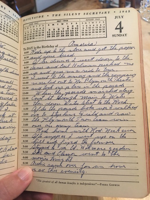 I went to the Armory and the company marched out to No. Plymouth Theater and took our place in the parade. Then the parade marched along Court St through Main to Water then down Water Street to the Rock.