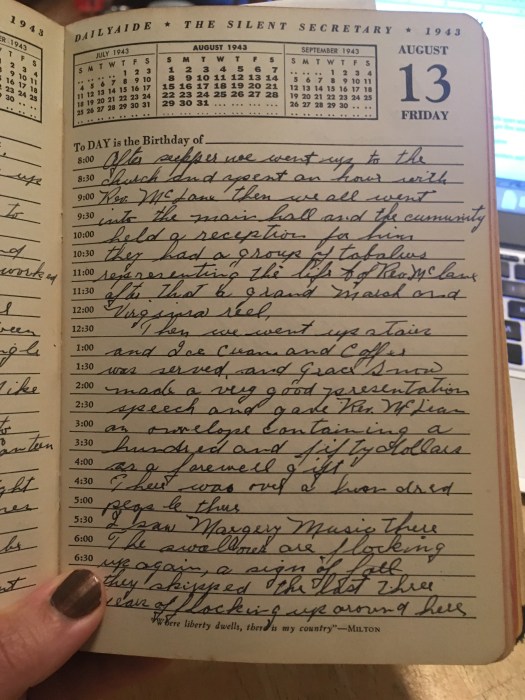 Then we went upstairs and ice cream and coffee was served, and Grace Snow made a very good presentation speech and gave Rev. McLane an envelope containing a hundred and fifty dollars as a farewell gift.