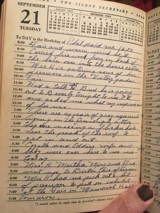 Mrs. H, Martha, Mary, and Bud went up to Boston this afternoon. Mrs. H had me pick out a lot of preserves to put on exhibit at the Fair in Memorial Hall tomorrow.