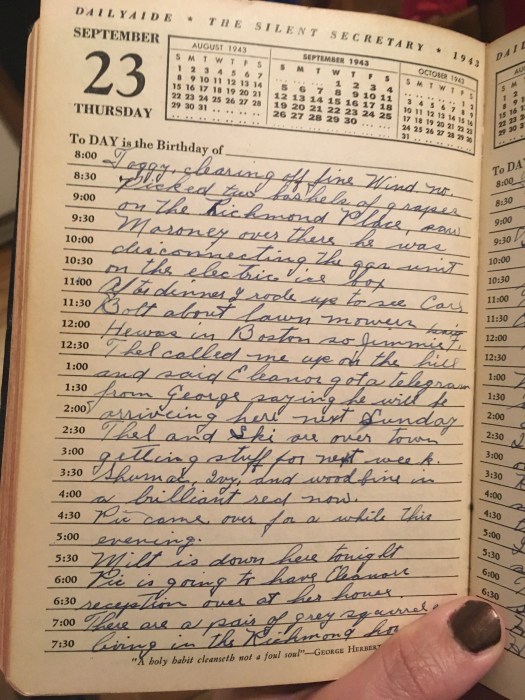 Picked two bushels of grapes on the Richmond place, saw Maroney over there, he was disconnecting the gas unit on the electric ice box.