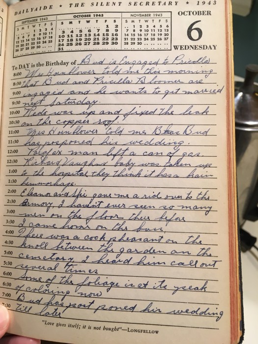 Mrs. Hornblower told me this morning that Bud and Priscilla Bloomer are engaged and he wants to get married next Saturday.
