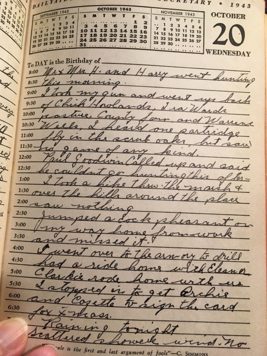 I took my gun and went up back of Chick Howlands, Ira Wards pasture, County farm, and Warren Wells. I heard one partridge fly in the scrub oaks, but saw no game of any kind.