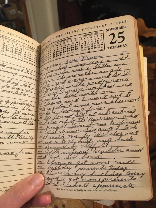 We found Sid at a boarding house out by the Nurseries, and brought him home to dinner. After dinner, Sid and I took a walk over by Walder’s and up on to the hill and back around by Cliff St.