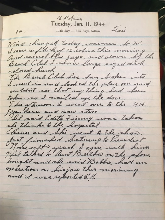 The Beach Club has been broken into. I went in and looked the place over and couldn’t see that anything had been taken, so I nailed up the door.