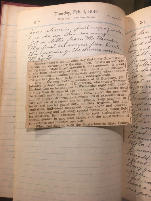 One of the most faithful members of 3rd Company, 25th Infantry is Jesse Brewer, of Cliff Street, who totes a Tommy Machine Gun on his shoulder at Wednesday night drill. Jesse is more than 50 years of age but indeed a real soldier and there isn’t much that he doesn’t know about the machine gun, let alone drill formations, mechanics of extended order, care and use of weapons and equipment, range practice, interior and special guard duty, military hygiene, first aid, sanitation, individual movement under cover and concealment, scouting and patrolling, special formations, minor field fortifications, field exercises, aid to civil authorities, and special studies in gas, road blocks, and the construction of concertinas and Molotov cocktails.”