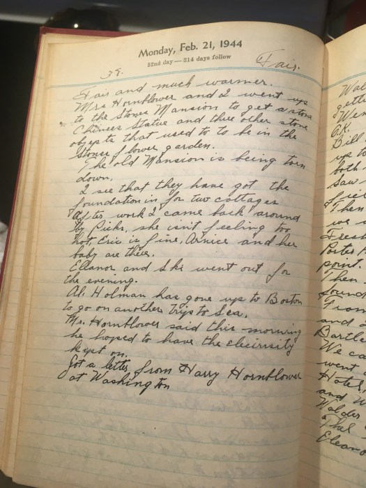 Mrs. Hornblower and I went up to the Stones Mansion to get a stone Chinese statue and three other stone objects that used to be in the Stones lower garden.