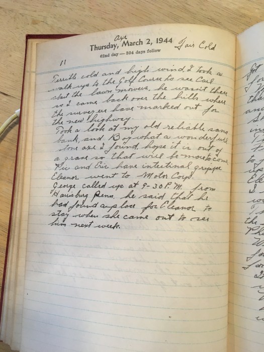 George called me up at 9-30 PM from Harrisburg Penn. He said that he had found a place for Elanor to stay when she came out to see him next week.