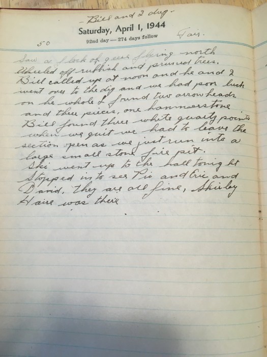 Bill called up at noon and he and I went over to the dig and we had poor luck on the while, I found two arrowheads and three pieces, one hammerstone. Bill found three white quartz points. When we quit we had to leave the section open as we just ran into a large small stone fire put.