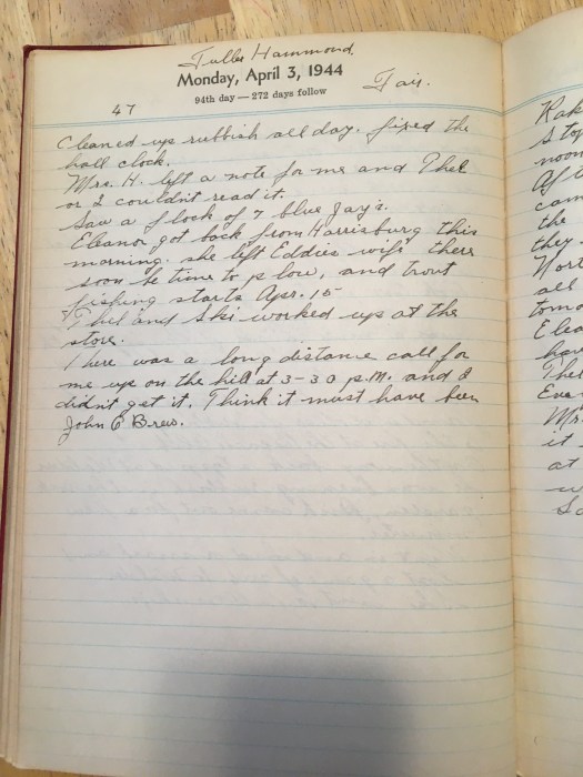 There was a long distance call for me up on the hill at 3-30 PM and I didn’t get it. Think it must have been John G. Brew.