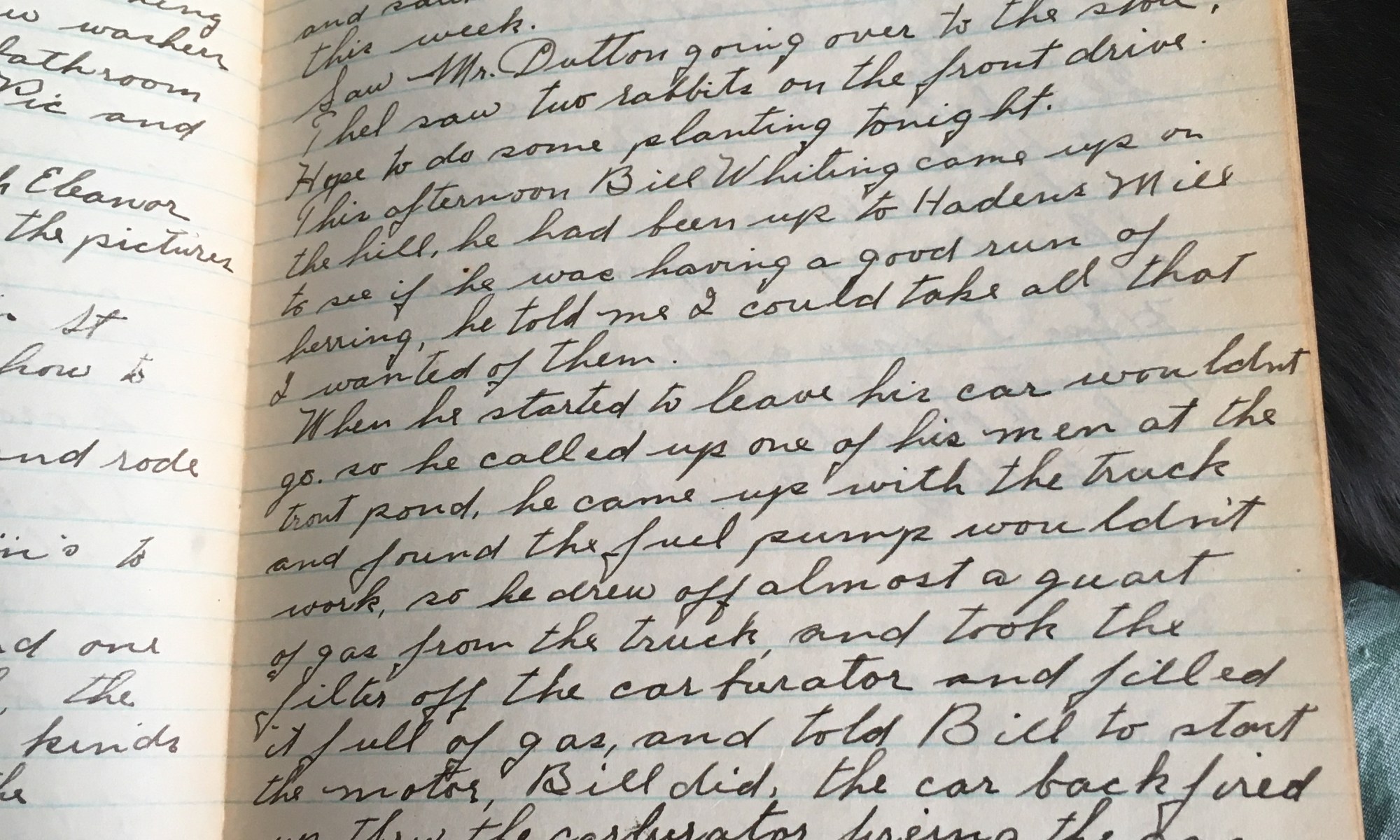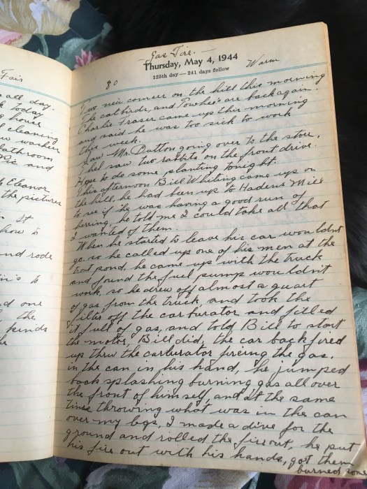 When he started to leave his car wouldn’t go so he called up one of his men at the trout pond. He came up with the truck and found the fuel pump wouldn’t work, so he drew off almost a quart of gas from the truck and told Bill to start the motor, Bill did, the car backfired up thru the carburetor, fireing the gas in the can in his hand. He jumped back, splashing the gas all over the front of himself and at the same time throwing what was in the can over my legs. I made a dive for the ground and rolled the fire out, he put his fire out with his hands, got them burned some.