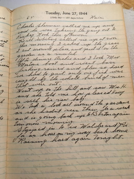 After dinner Archie and I took Mrs. Mortonās boat and went bass fishing and blew so hard we had to quit. Only one fish was caught by the whole bunch of men that were out.