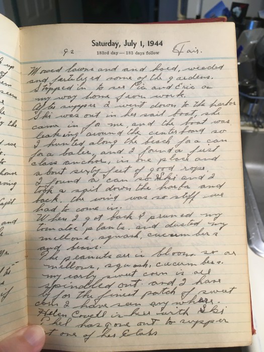 After supper I went down to the harbor. Ski was out in her sail boat, she came in for me and the boat was leaking around the centerboard so I hunted along the beach for a can for a baler and I found a first class anchor in one pace and about sixty feet of good rope.
