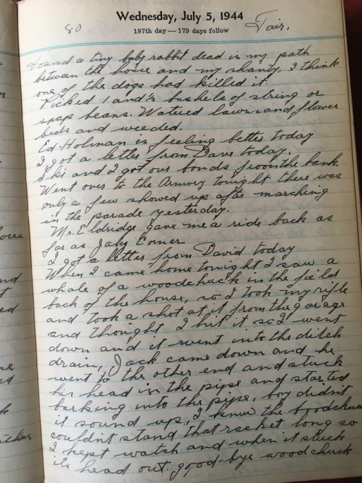 I got a letter from David today. When I came home tonight I saw a whale of a woodchuck in the field back of the house and took a shot at it from the garage and thought I hit it so I went down and it went into the ditch drain, Jack came down and he went to the other end and stuck his head in the pipe and started barking into the pipe, boy didn’t it sound up. I know the woodchuck couldn’t stand that racket long so I kept watch and when it stuck its head out, goodbye woodchuck