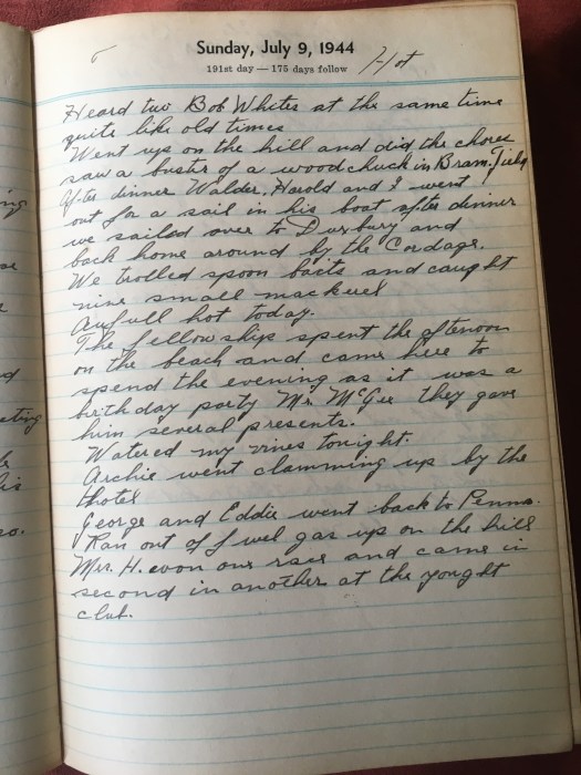 After dinner Walder, Harold, and I went out for a sail in his boat after dinner, we sailed over to Duxbury and back home around by the Cordage.