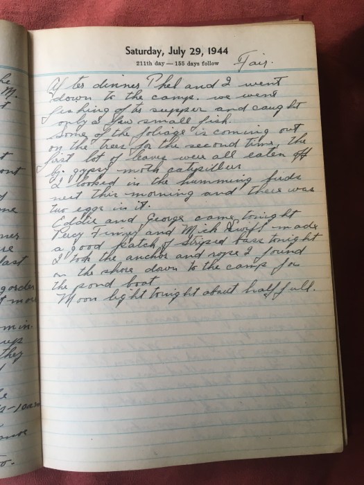 After dinner Thel and I went down to the camp We went fishing after supper and caught only a few small fish.