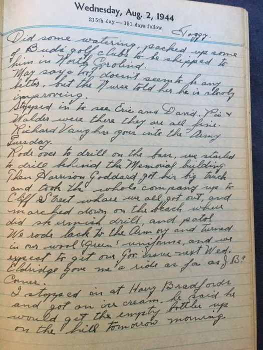 Rode over to drill on the base, we started to drill behind the Memorial building. Then Harrison Gooddard got his big truck and took the whole company up to Cliff Street where we all got out and marched down on the beach where we did skirmish drill and patrol.