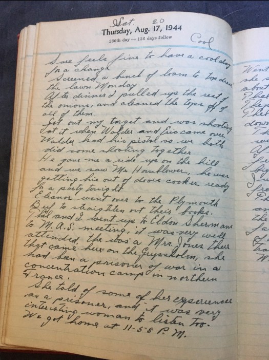 THel and I went up to Eldon Sherman and to M.A.S meeting, it was very well attended, there was a Mrs. Jones there that came here on the Gripsholm, she had been a prisoner of war in a concentration camp in Northern France.