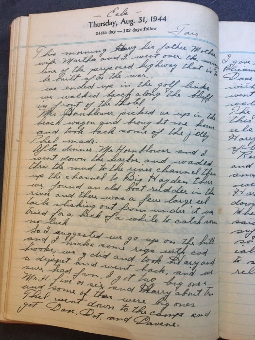 After dinner Mr Hornblower and I went down the harbor and waded thru the mud to the river channel then up the channel to Big Hayden there we found an old boar rudder in the river and there was a few large eel tails sticking out from under it, we tried for a heck of a while to catch some, no luck.