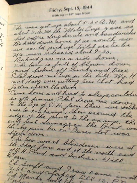 Came home and tried to sleep, couldn’t’, so after dinner, Thel drove me down to the top of G.H. from there we walked over to 2-4 camps, then around the edge of the pond to the camp. The only real damage on the point was the big pine tree on Dave’s lot was blown down.