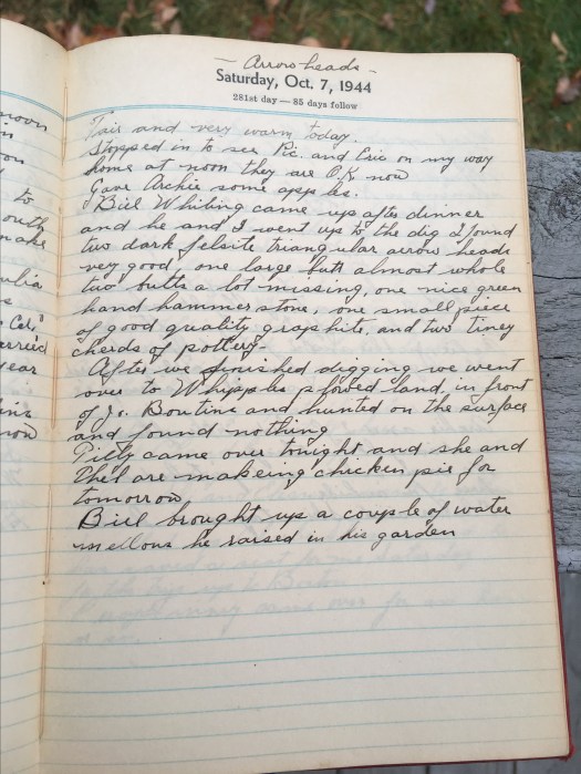 Bill Whiting came up after dinner and he and I went up to the dig, I found two dark felsite triangle arrowheads, very good, one larger but almost whole, two butts, a lot missing, one nice green hand hammer stone, one small piece of good quality graphite and two tiny shards of pottery.