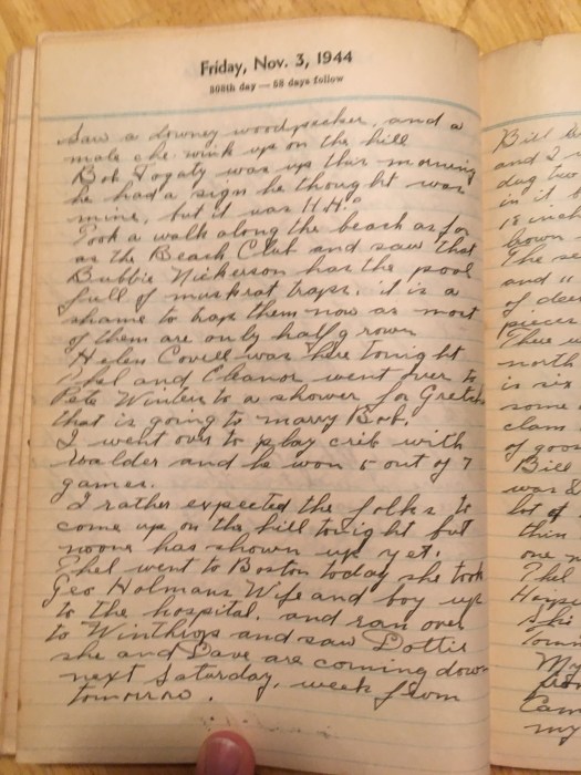 Thel went to Boston today, she took Geo Holmanās wife and boy up to the hospital and ran over to Winthrops and saw Dottie, she and Dave are coming down next Saturday week from tomorrow.