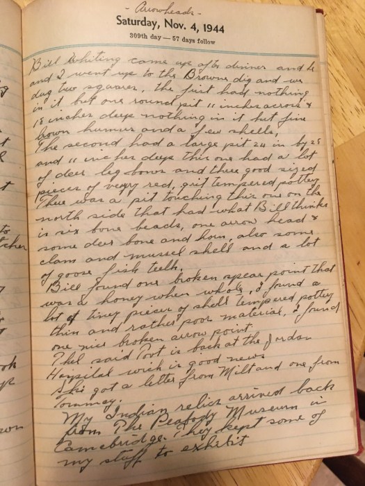 Bill Whiting came up after dinner and he and I went up to the Browns dig and we dug two squares, the first had nothing in it but one round pit 11 inches across and 18 inches deep nothing in it but fine brown hummus and a few shells.
