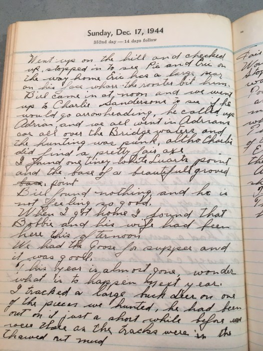 Bill came in at noon and we went up to Charlie Sandersons to see if he would go arrowheading, he called up Adrian and we all went in Adrian’s car all over the Bridgewaters and the hunting was punk, altho Charlie did find a pretty fair axe.