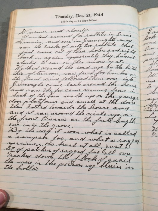 Walked around the road up on the hill this afternoon, saw fresh fox tracks on the front drive, followed them over onto Greenoughs, came back around the house and saw the fox come around from in back of the farm, walk up on the garage door platform and smell at the doors, then trotted towards the house and it ran around the circle up on the front Piazza and the full length over into the grove.