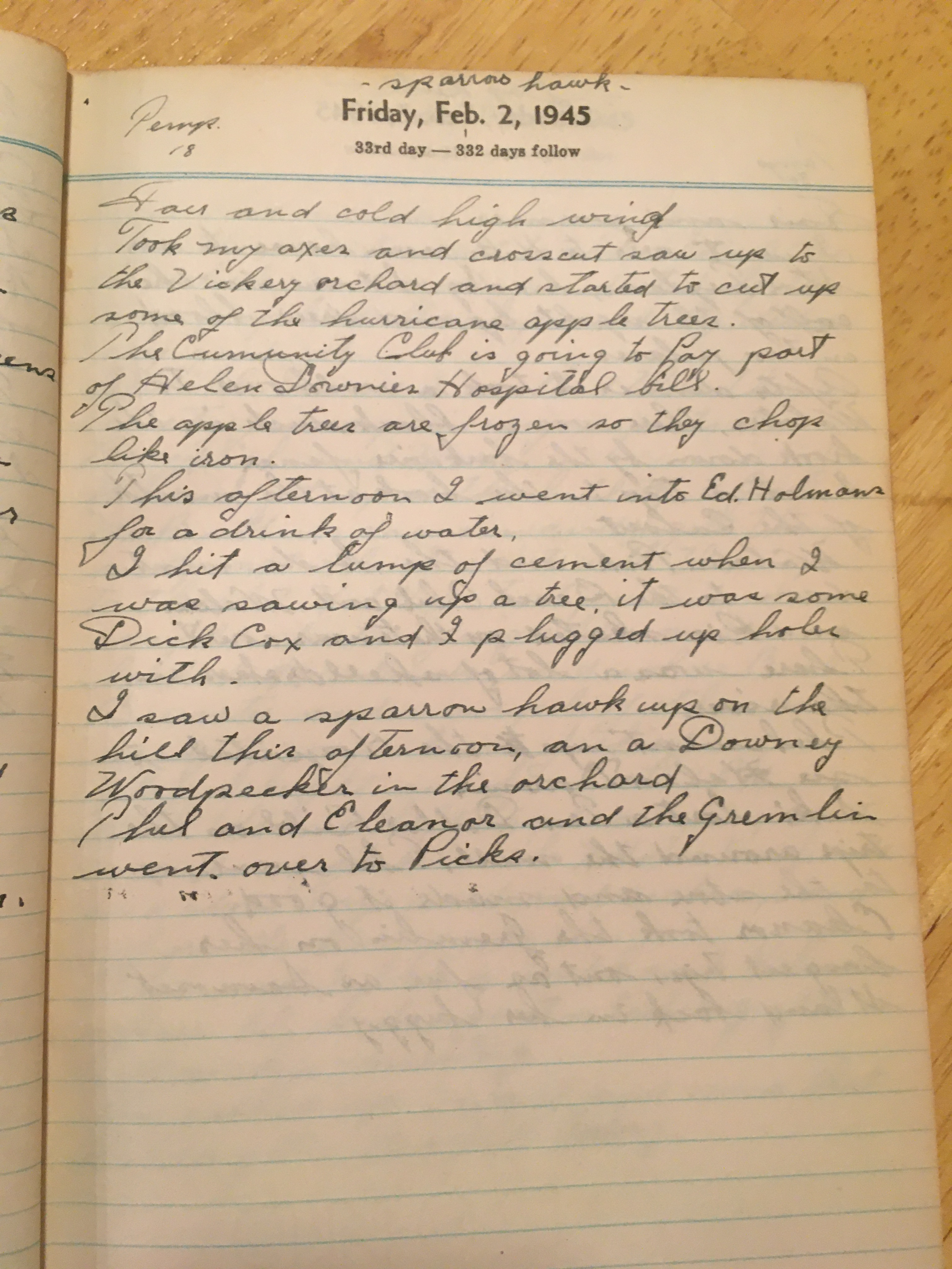 I saw a sparrowhawk up on the hill this afternoon and a Downey Woodpecker in the orchard.