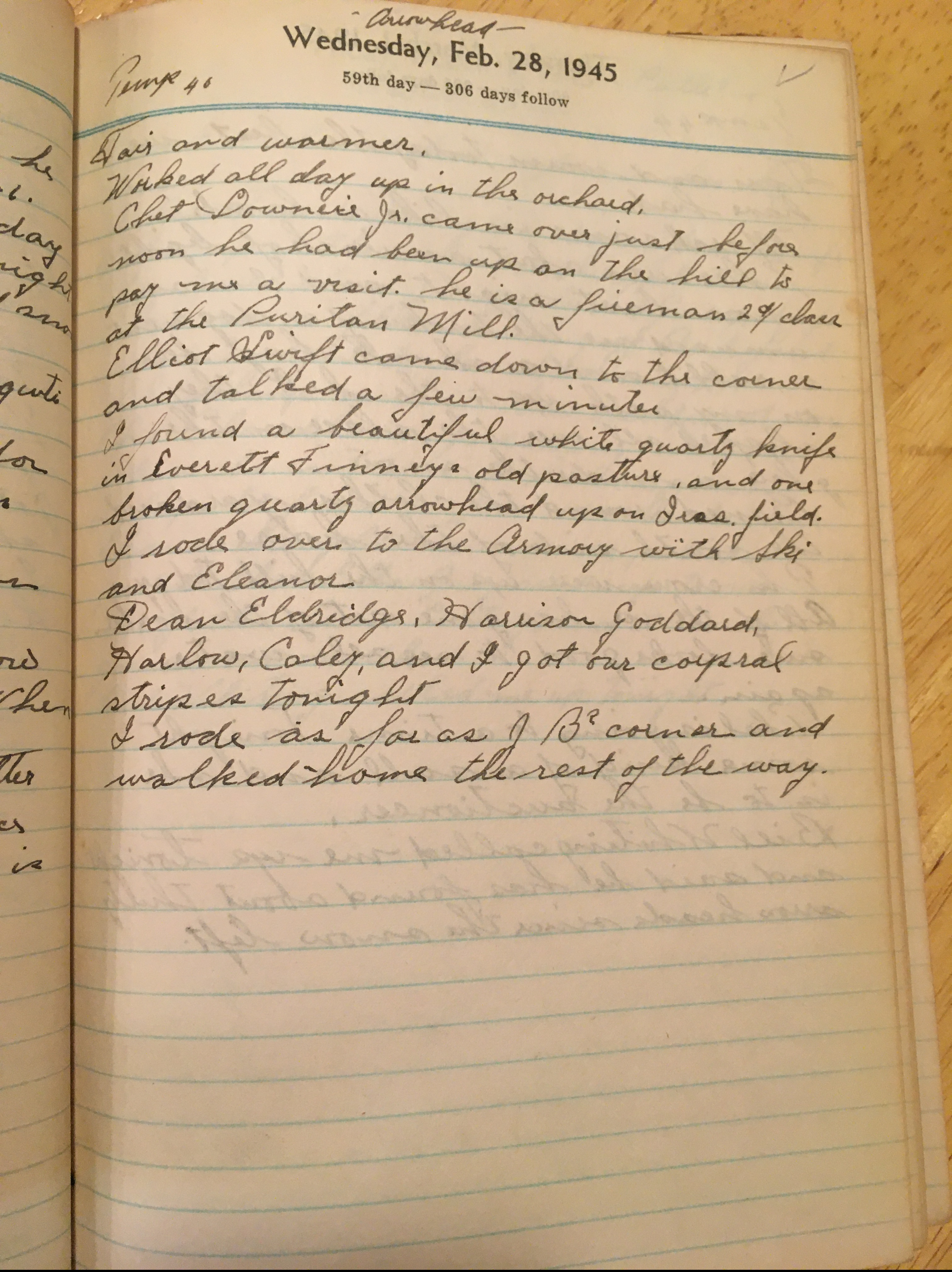 Chet Downie Jr came over just before noon, he had been up on the hill to pay me a visit. He is a fireman 21st class at the Puritan Mill.