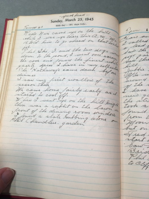 Thel, Ski, I and the two dogs went down to the pound, I went over across the cove and found the finest white quartz spear I have in my collection.