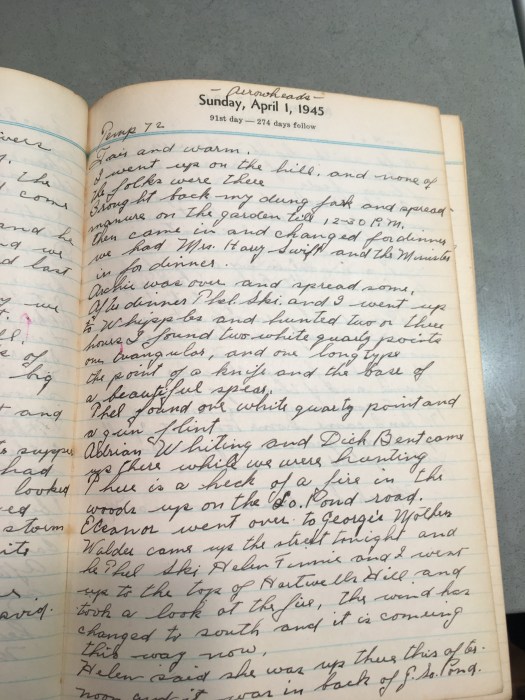 After dinner, Thel, Ski, and I went up to the Whipples and hunted two or three hours. I found two white quartz points, one avangular, and one long type the point of a knife and the base of a beautiful spear.