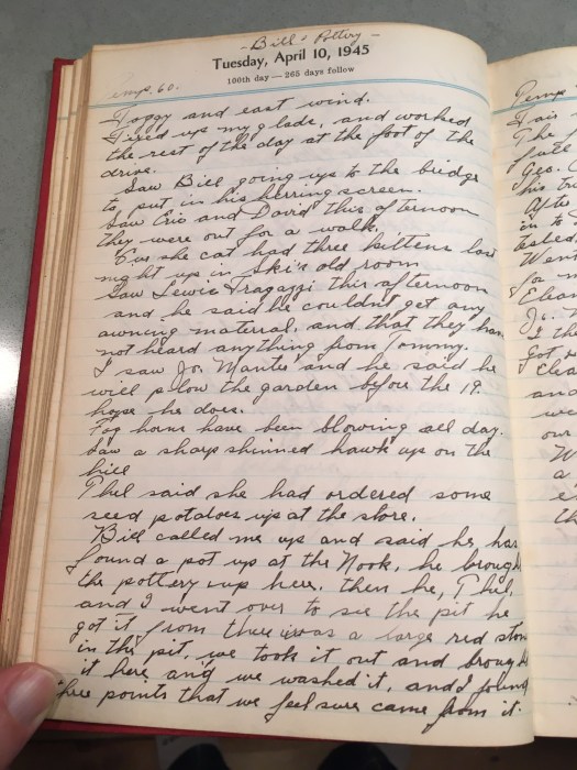 Bill called me up and said he has found a pot up at the Nook, he brought the pottery up here then he, Thel, and I went over to see the pit he got it from. There was a large red stone in the pit, we took it out and brought it here and we washed it and I found three points that we feel sure it came from.