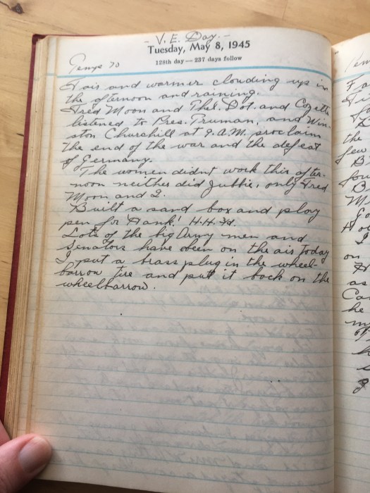 Fred Moon and Thel, Dot, and Cozette listened to Pres Truman and WInston Churchill at 9 AMproclaim the end of the war and the defeat of Germany.