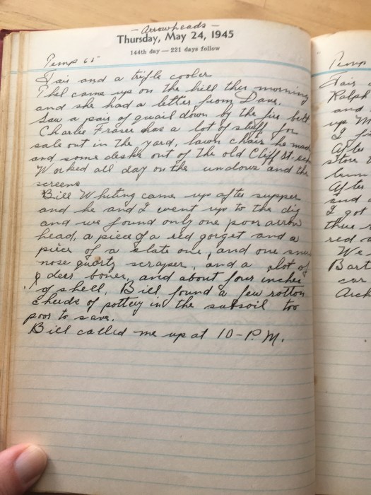 Bill Whiting came up after supper and he and I went up to the dig and we found only one poor arrowhead, a piece of red gorget and a piece of a slate one, and one small nose quartz scraper, and a lot of deer bones, and about four inches of a shell. Bill found a few rotten shards of pottery in the subsoil, too poor to save.