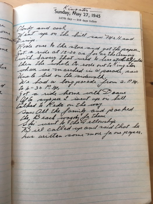 Got a ride at 12-30 as far as the Armory with Savery that used to live at [***] then the whole Co rode out to Kingston where we marched in a parade, saw Uncle Sid on the sidewalk.