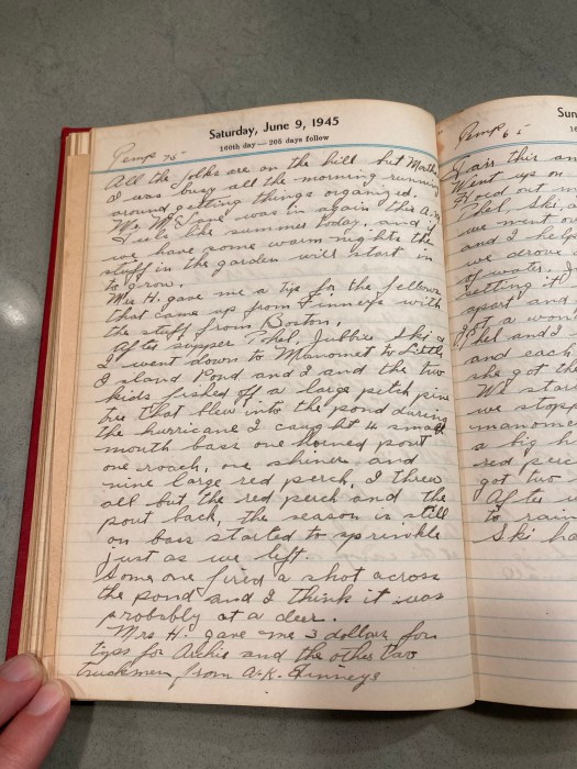 After supper, Thel, Jubbie, Ski, and I went down to Manomet to Little Island Pond and I and the two kids fished off a large pitch pine tree that blew into the pond during the hurricane. I caught a small mouth bass, one horned pout, one roach, one shiner and nine large red perch. I threw all but the red perch and the pout back, the season is still on bass, started to sprinkle as we left.
