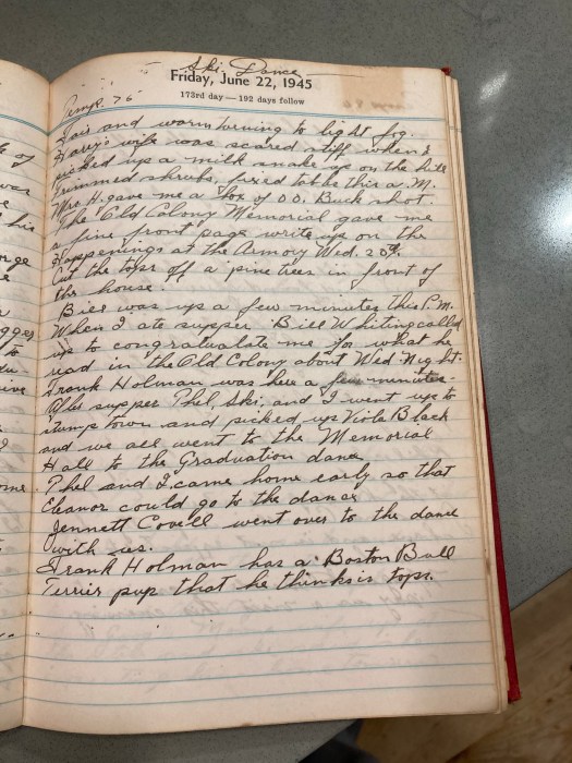 After supper, THel, Ski, and I went up to stump town and picked up Viola Black and we all went to the Memorial Hall to the Graduation dance.