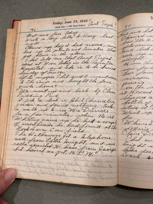 Thel told me that Aunt Tirzah died at Noon today in the Taunton Hospital and she is to be buried Sunday afternoon.