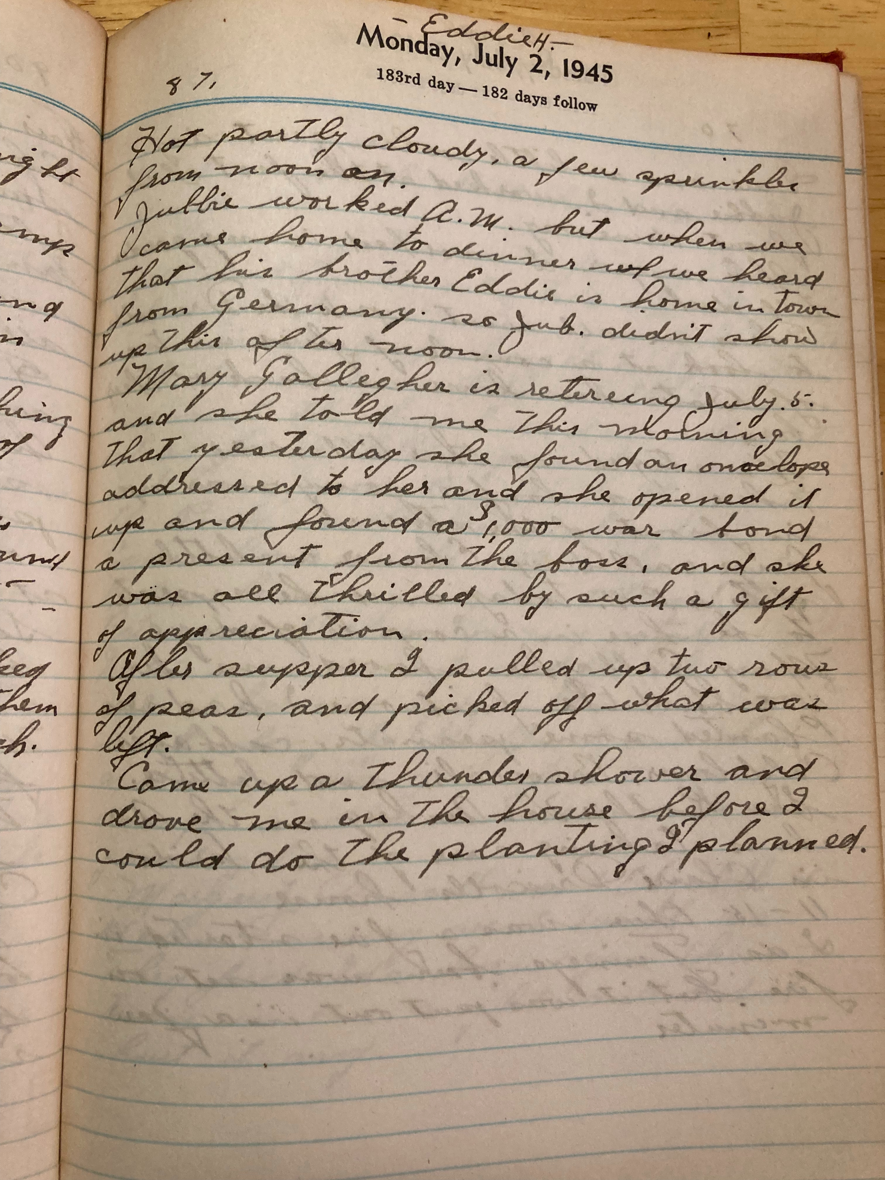 Mary Gallagher is returning July 5 and she told me this morning that yesterday she found an envelope addressed to her and she opened it up and found a 1000 war bond, a present from the boss and she was all thrilled by such a gift of appreciation.