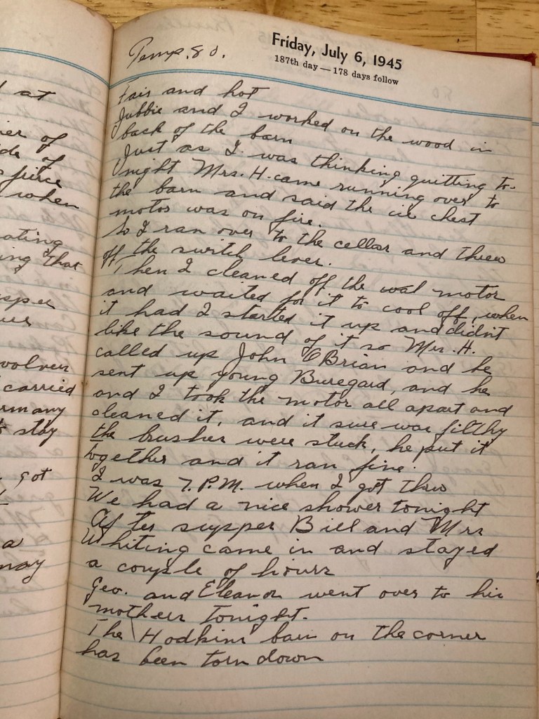 Then I cleaned off the motor and waited for it to cool off when it had I started it up and didn’t like the sound of it so Mrs H called up John OBrian and he sent up young Beuregard and he and I took the motor all apart and cleaned it and it sure was filthy, the brushes were stuck, he put it together and it ran fine.