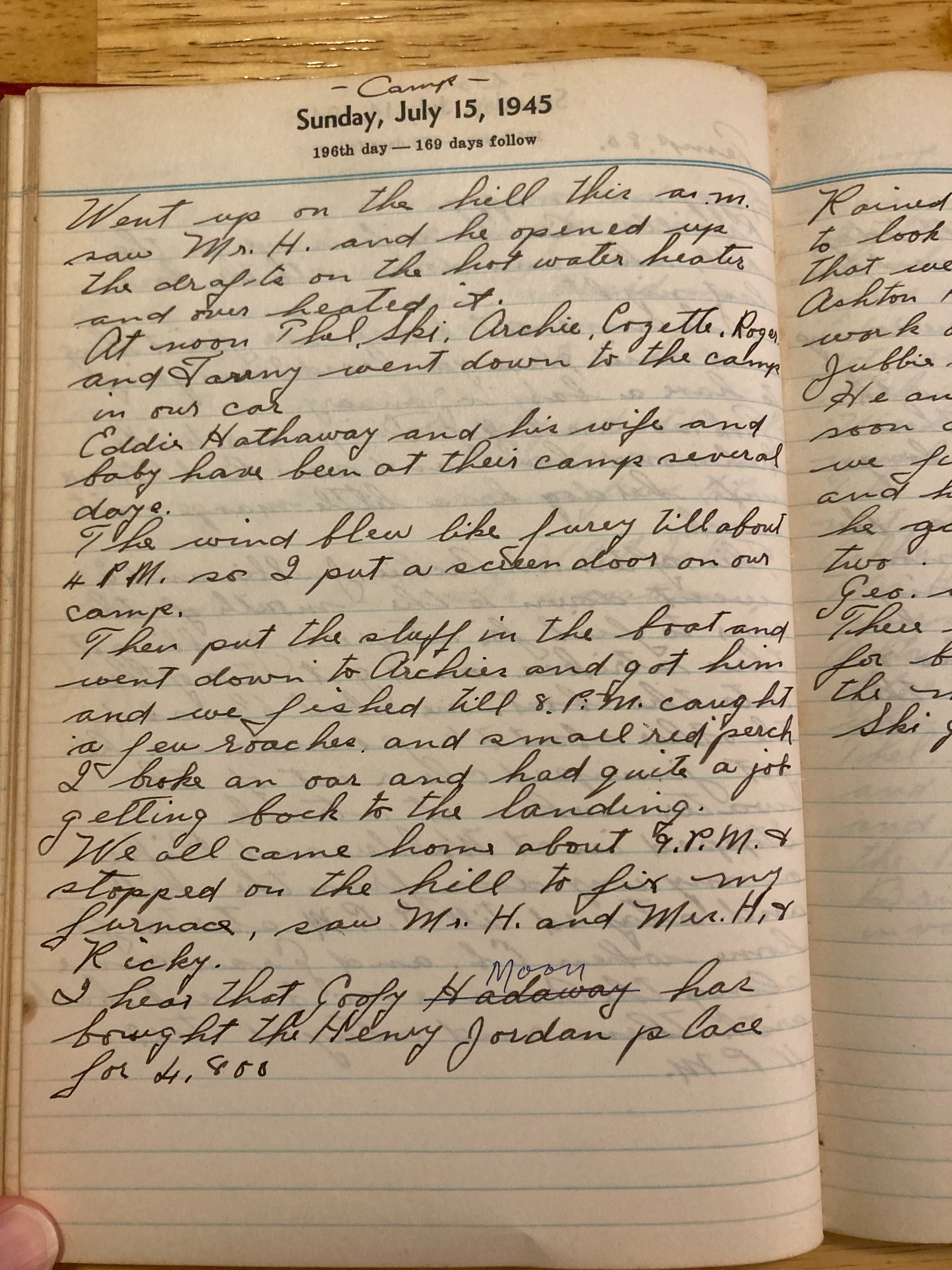 At noon Thel, Ski, Archie, Cozette, Roger, and Fanny went down to the camp in our car.