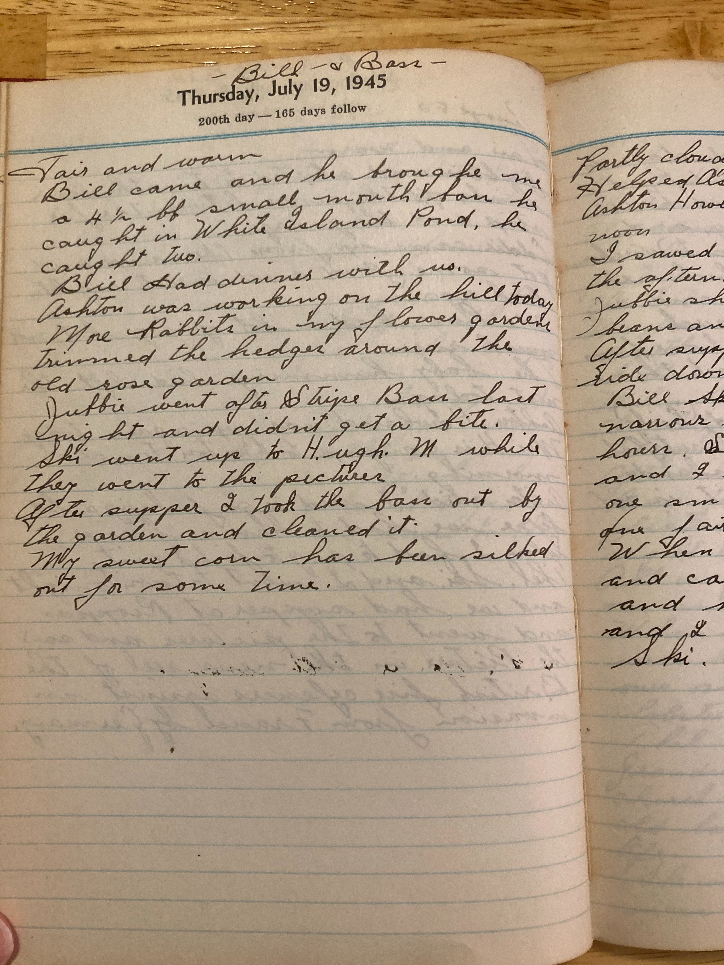 Bill came and he brought me a 4 ½ lb small mouth bass he caught in White Island Pond, he caught two.