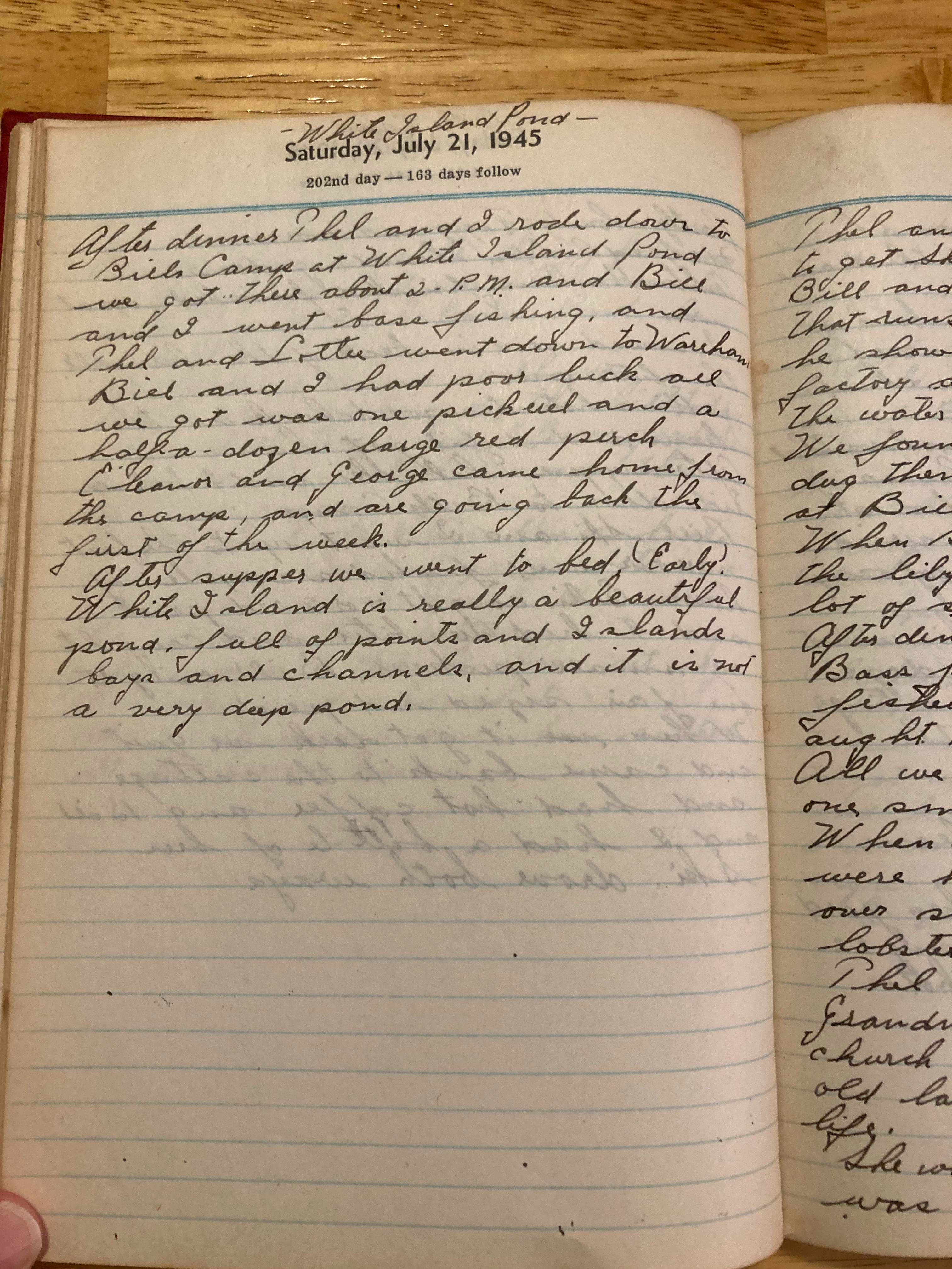 After dinner Thel and I rode down to Bill’s Camp at White Island Pond. We got there about 2 PM and Bill and I went bass fishing and Thel and Lottie went down to Wareham.