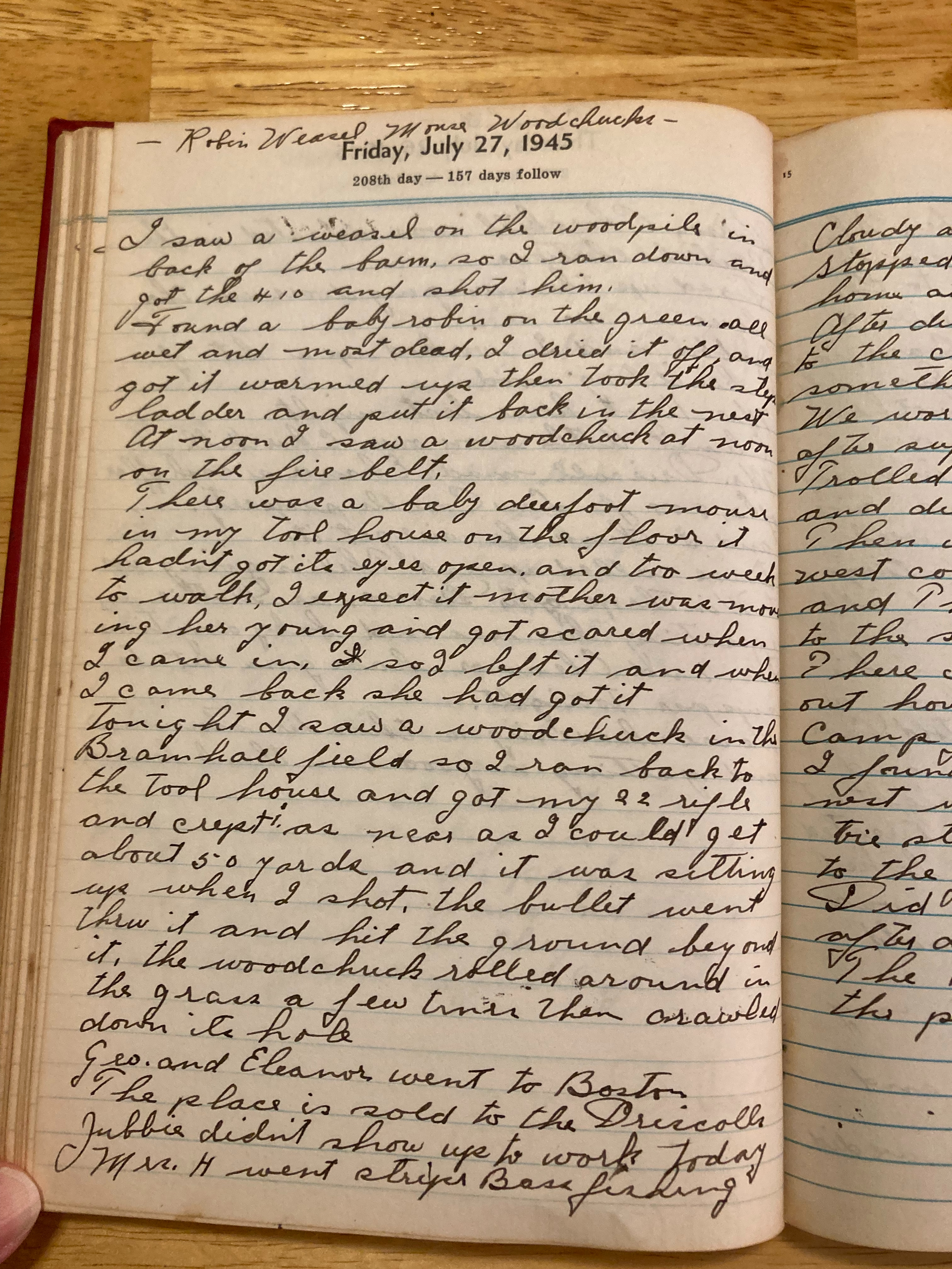 Tonight I saw a woodchuck in the Bramhall field so I ran back to the tool house and got my 22 rifle and crept as near as I could get about 50 yards and it was sitting up which I shot, the bullet went thru it and hit the ground beyond it, the woodchuck rolled around in the grass a few times then crawled down its hole.