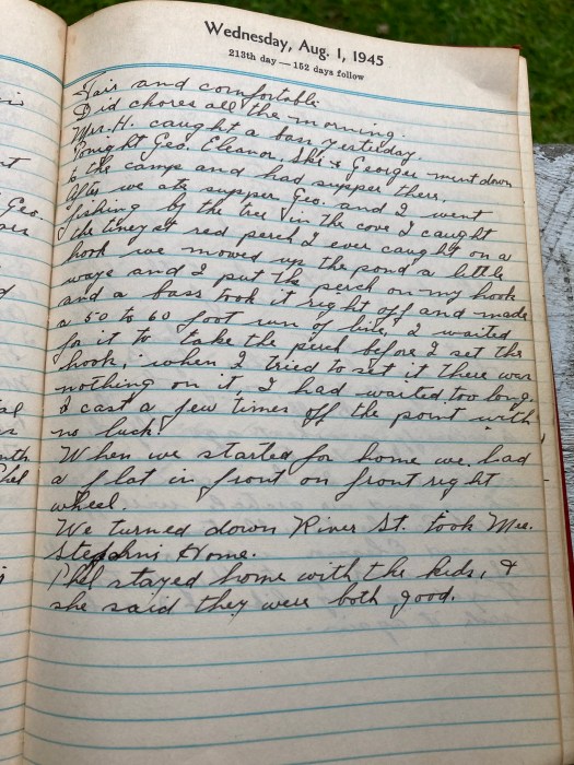 After we ate supper Geo and I went fishing by the tree in the cove, I caught the tiniest red perch I ever caught on a hook. We moved up the pond a little ways and I put the perch on my hook and a bass took it right off and made a 50 to 60 foot run of line, I waited for it to take the perch before I set the hook, when I tried to set it there was nothing on it, I had waited too long.