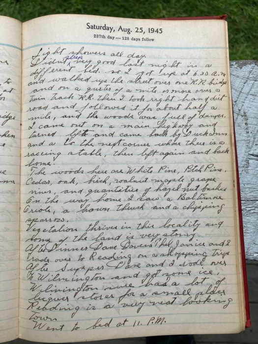 Didn’t sleep good last night in a different bed so I got up at 630 am and walked up the street over one RR Bridge and on a quarter of a mile or more over twin track RR then I took a right hand dirt road and followed it for about half a mile, and the woods was full of damps.