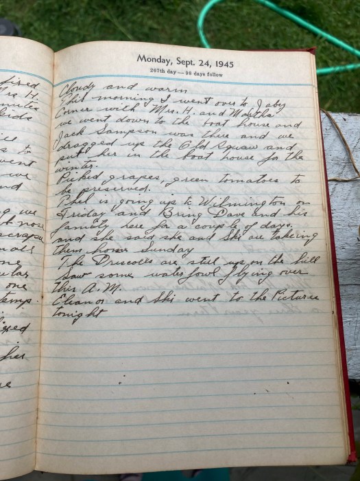 This morning I went over to Jabez Corner with Mrs H and Martha, we went down to the boat house and we dragged up the Old Squaw and put her in the boat house for the winter.