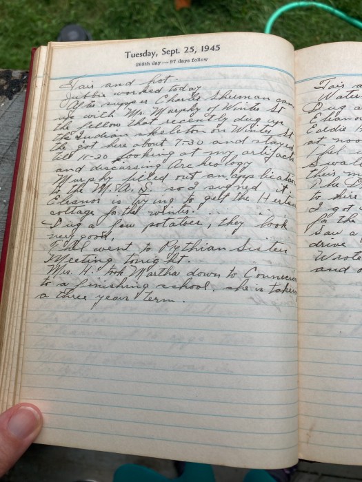 After supper Charlie Sherman came up with Mr Murphy of Winter St, the fellow that recently dug up the Indian skeleton on Winter St. THey got here about 7-3- and stayed till 11-30 looking at my artifacts and discussing Archeology.